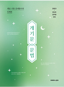 『2023 개기문 문법』은 문법 기본 개념과 기출 문제를 한 권에 담은 문제집입니다. 최근 출제 경향성을 고려하여 문제를 선별하고, 문제 유형을 세분화하여 유사한 기출 문제를 연속하여 풀어 볼 수 있도록 구성하였습니다. 문제 하단에 해설을 배치한 ‘상문하해’ 구성으로 빠르고 효과적으로 해설을 확인할 수 있도록 하였습니다. 더 많은 문제를 풀어보고 싶은 수험생들을 위해 연구실 홈페이지에서 문법 동형 문제를 무료로 배포하고 있습니다.